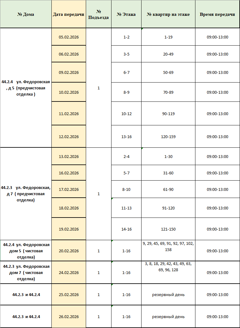 Информируем о графике передачи ключей от квартир: